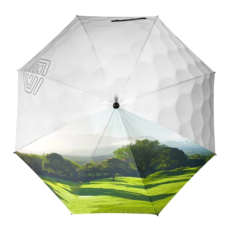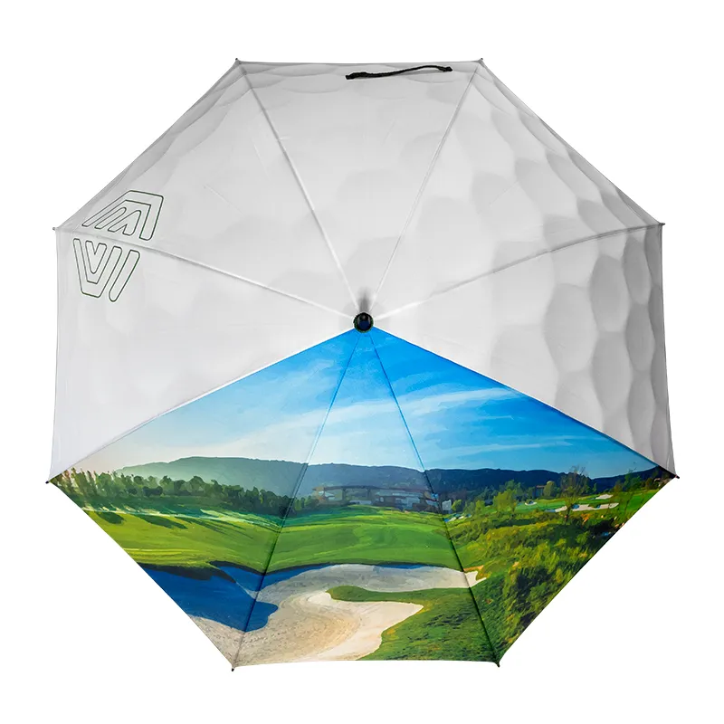 The canopy features prints inspired by golf courses and golf ball elements, creating a strong thematic connection to the sport. The design enhances brand storytelling and makes the umbrella suitable for tournaments, club merchandise, and promotional programs.